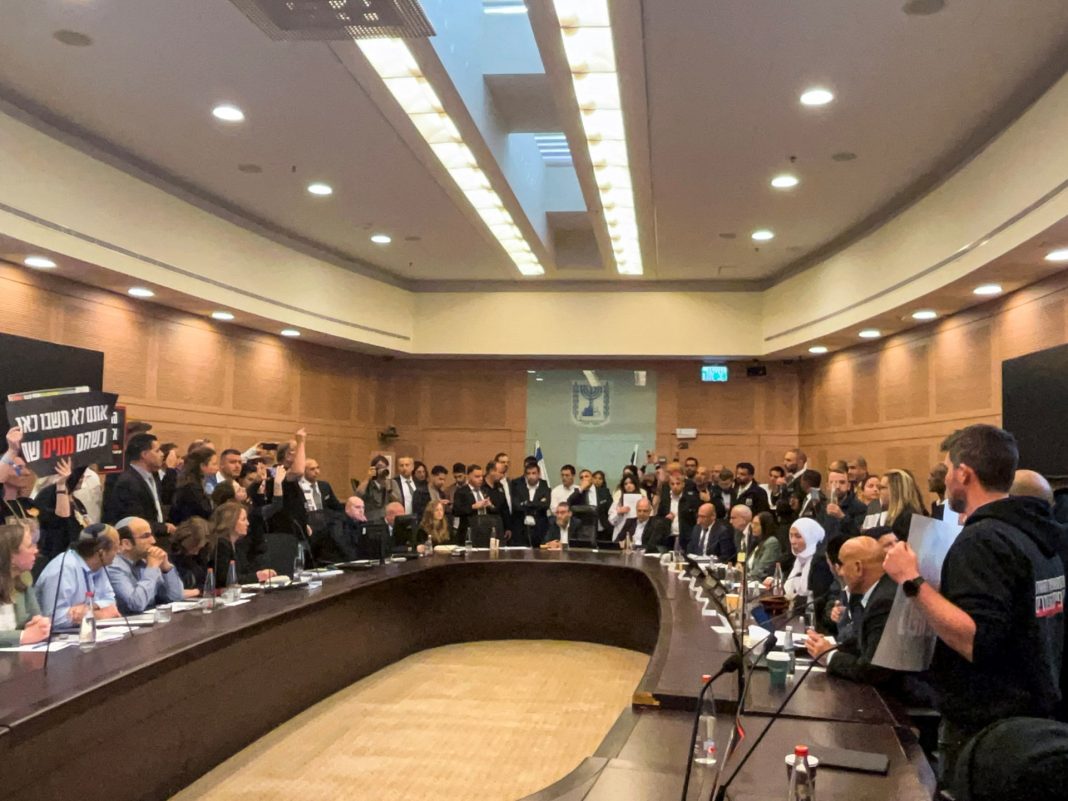 Relatives of Israelis being held hostage in Gaza by Hamas have stormed a parliamentary committee session in Jerusalem, demanding lawmakers do more to free their loved ones.