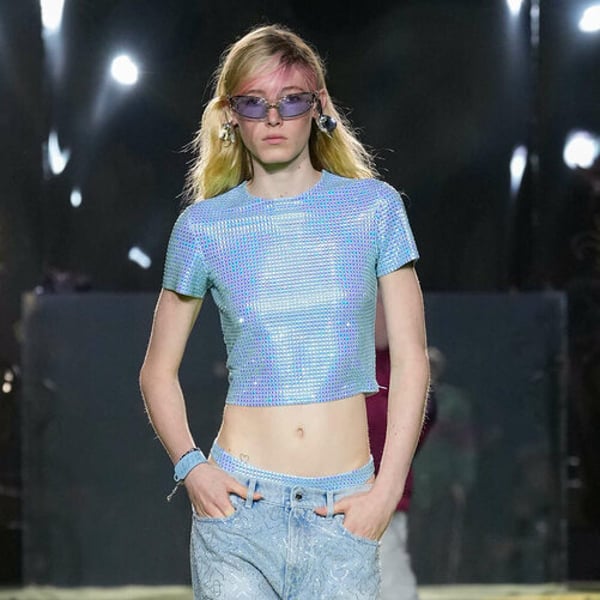 Everything shimmered with a cascade of glossy materials and rainbow gradients, while lightness prevailed in organza jackets and ultralight nylon trousers, short-sleeved shirts and blousons. Light radiated at every step, whether from rhinestone-encrusted looks or blindingly white ensembles. Micro shorts paired with a blouson; a sequin skirt teamed with a zip-up tracksuit jacket; the striped knit version met a rhinestone bralette; and low-rise indigo jeans were slipped over an ultra-high-cut swimsuit in the same denim.