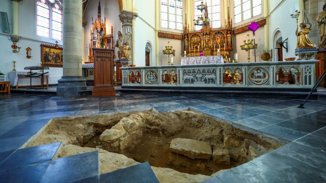 Workers discovered the grave, containing human remains, in front of the altar after part of the floor of St Peter and Paul Church in Maastricht subsided.