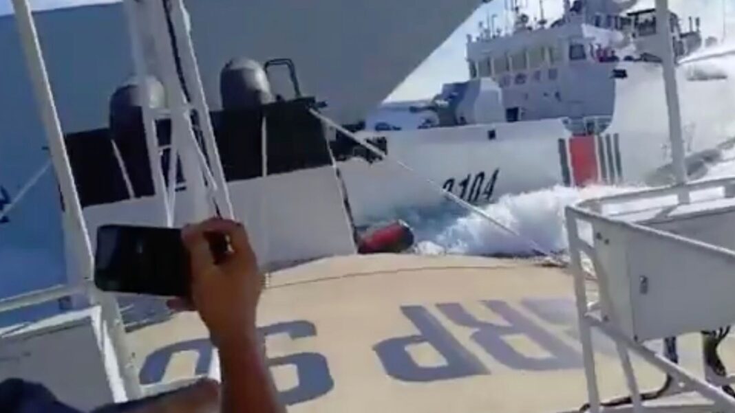 Philippine Coastguard footage showed a Chinese Coastguard ship tracking the Suluan before a Chinese navy ship, bearing the number 164 on its hull, suddenly cut across its path, colliding with it and damaging the smaller vessel’s forecastle.