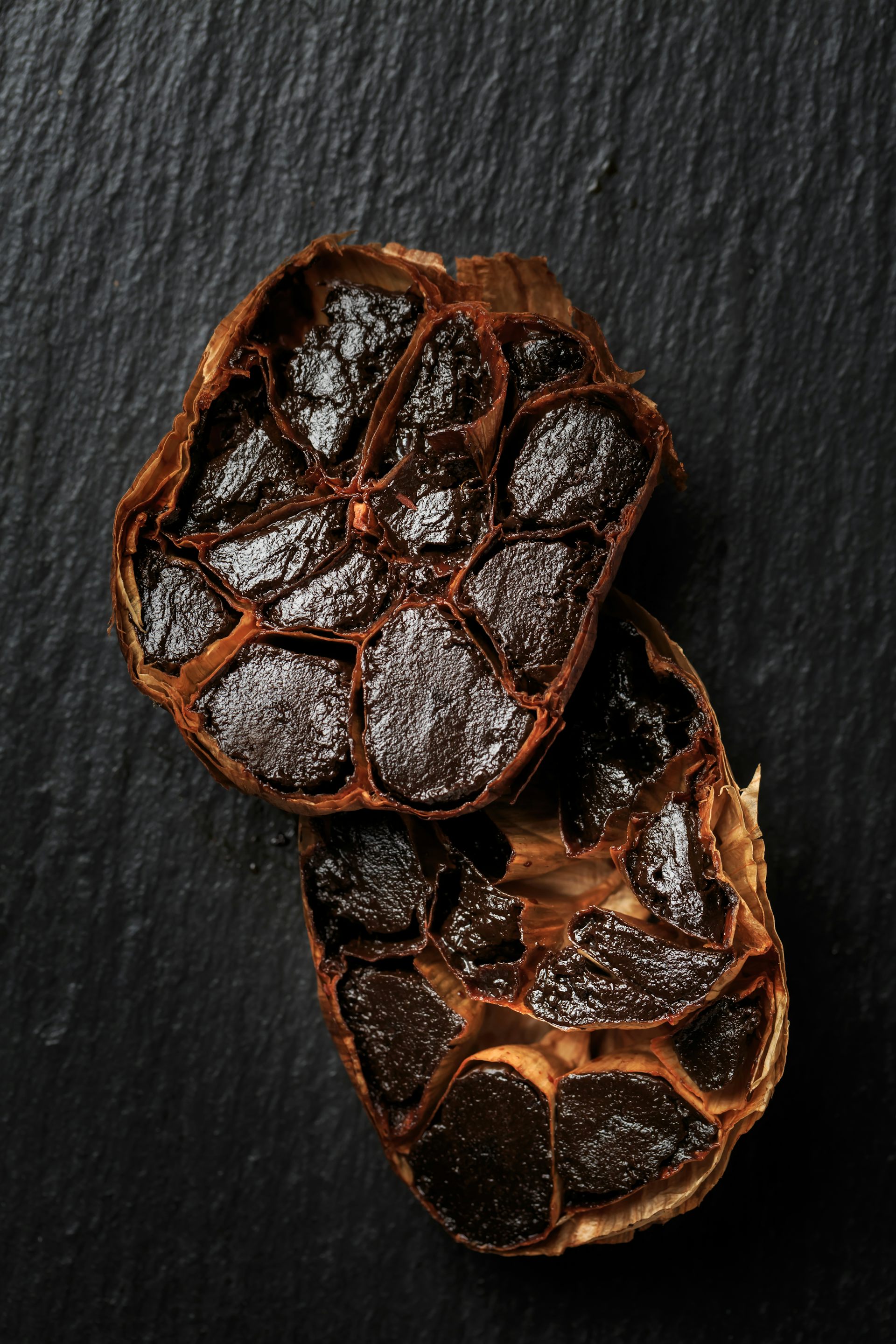 While raw garlic has a sharp, pungent taste, black garlic typically has a milder, slightly sweet taste. The underlying chemistry is complex, but the basic idea is straightforward: Heat and humidity transform both the taste and structure of garlic. These shifts in flavor happen because the compound responsible for garlic’s strong taste breaks down during the heating process. At the same time, heat-driven reactions form new compounds that contribute to a smoother and more complex flavor.