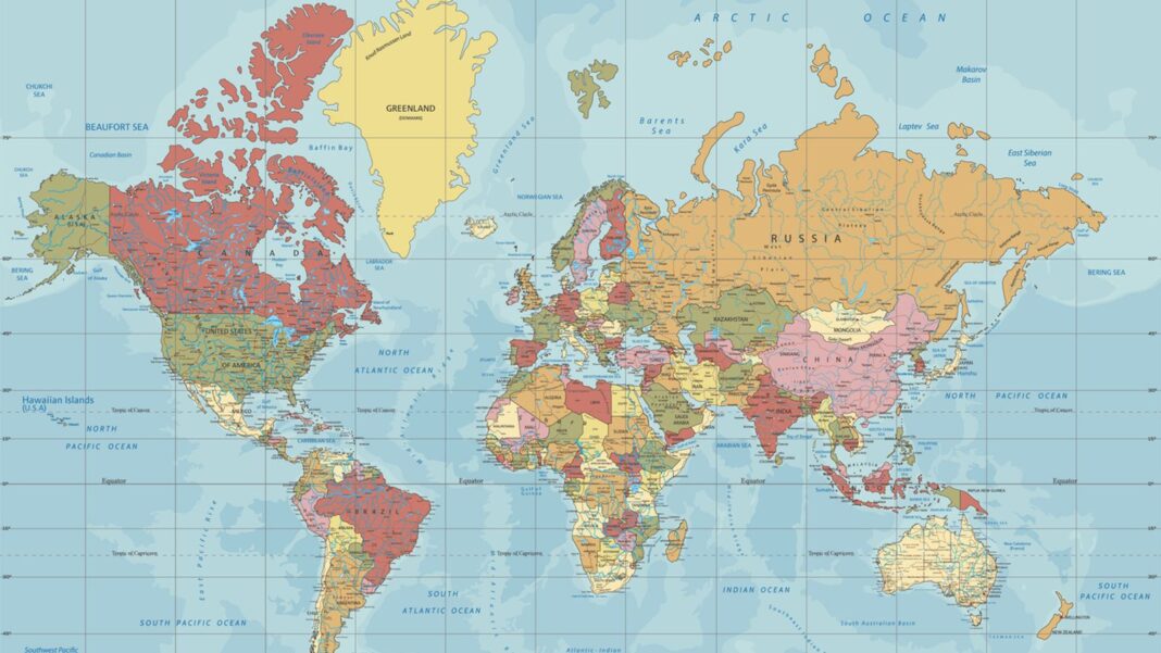 The Mercator projection of the world distorts the sizes of some continents, enlarging areas near the poles like North America and Greenland while shrinking Africa and South America.